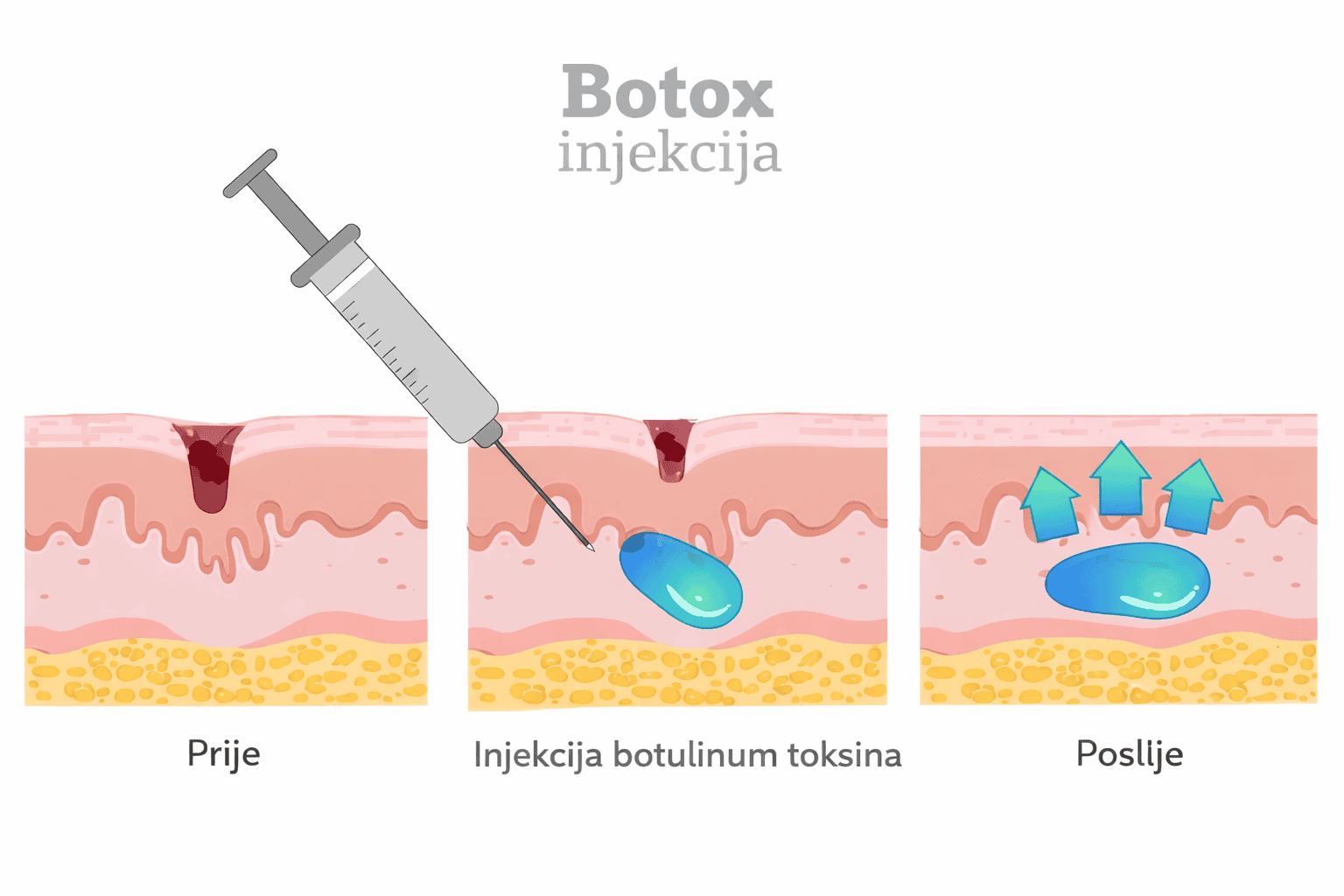 Botox djeluje na mišiće koji uzrokuju bore i na taj način smanjuje njihovu aktivnost, dok koža iznad njih postaje glatkija i manje napeta.